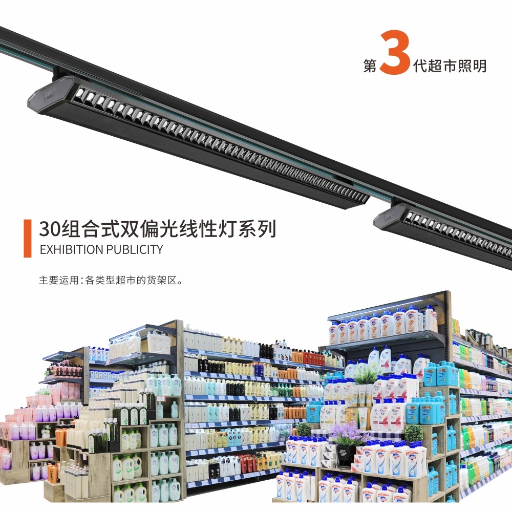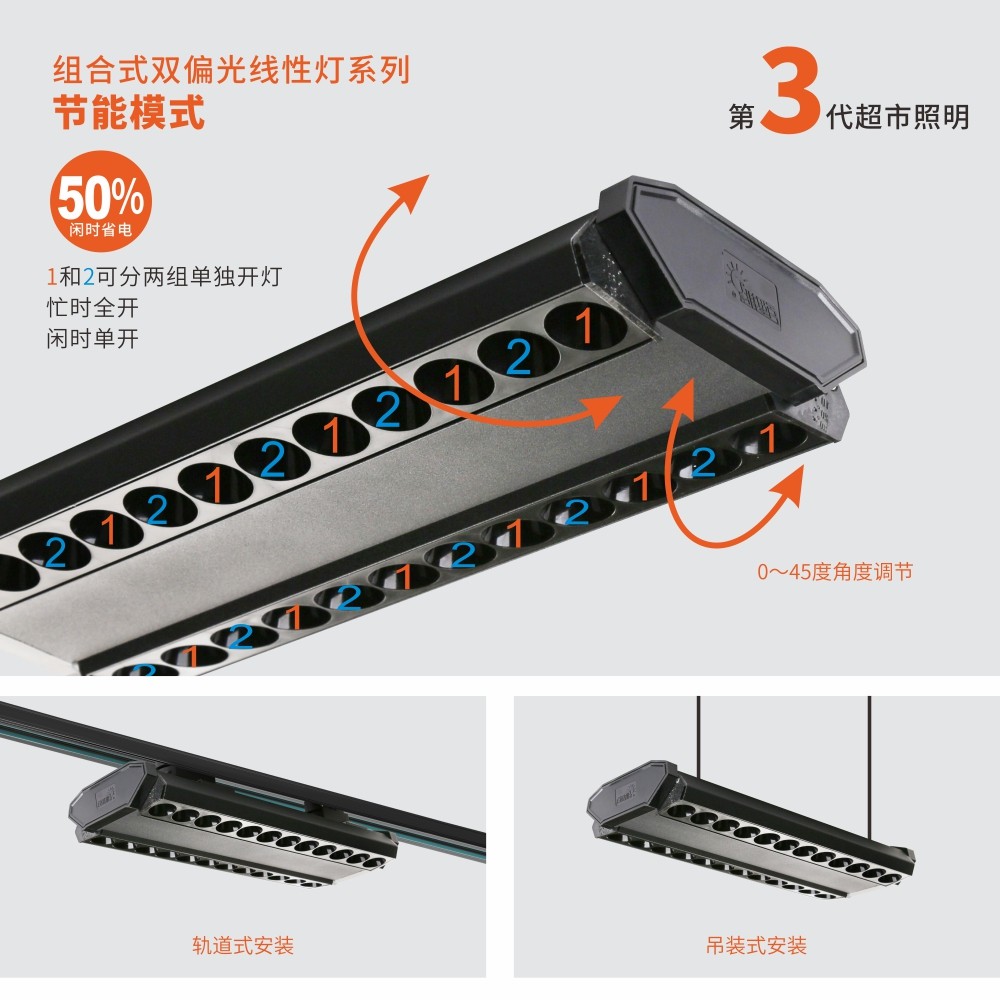 第3代超市照明,貨架照明利器,節(jié)能模式,1和2可分兩組單獨開燈,忙時全開,閑時單開,溫度更低,讓生鮮持久新鮮,解放天花板。標準0~45度限位照射角度調節(jié)可滿足1~2.4米雙邊貨架通道照明需求,軌道式/吊裝 兩種安裝方式,主要運用:各類型超市的生鮮區(qū)、貨架區(qū)、促銷堆頭。此產品均可定制生鮮專用光色。